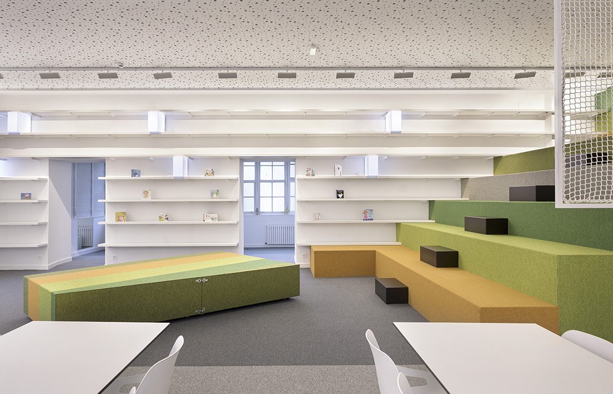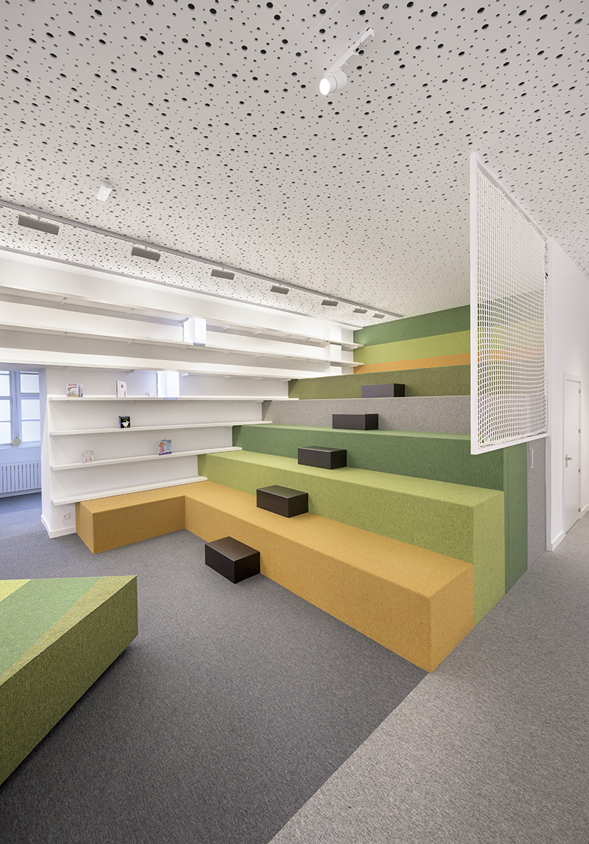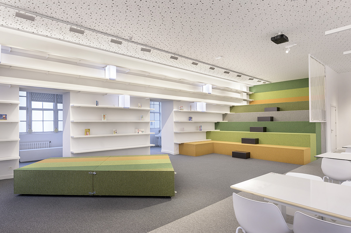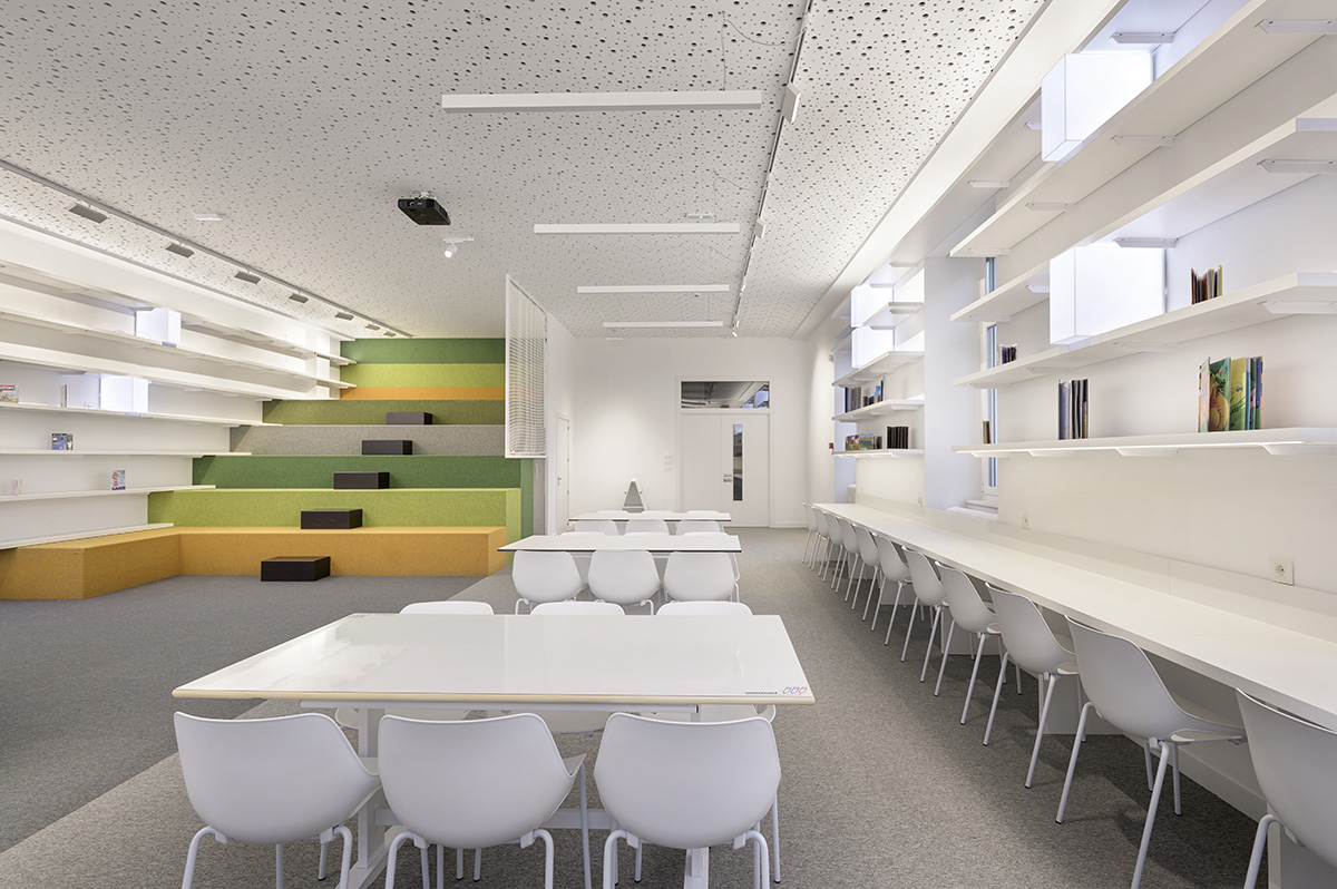 No se trata solo de un espacio donde el punto de partida estilístico y conceptual es la biblioteca, un lugar para leer y estudiar, sino también, un nuevo lugar moderno en el colegio que será transformado en un espacio multifuncional. Debíamos combinar las distintas zonas (mesas para el estudio, diferentes rincones de lectura, un graderío para recibir charlas, una zona de teatro y presentaciones, un espacio de almacenaje y una sala bajo el graderío para el deleite de los más txikis) en un solo espacio multifuncional equilibrado.