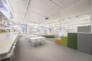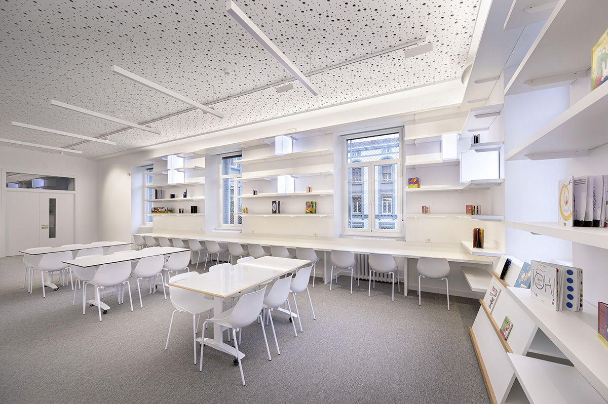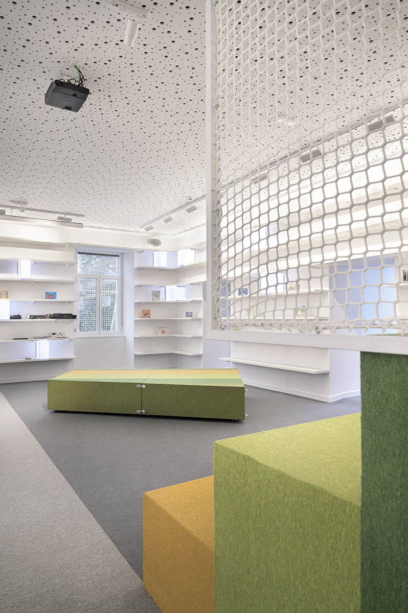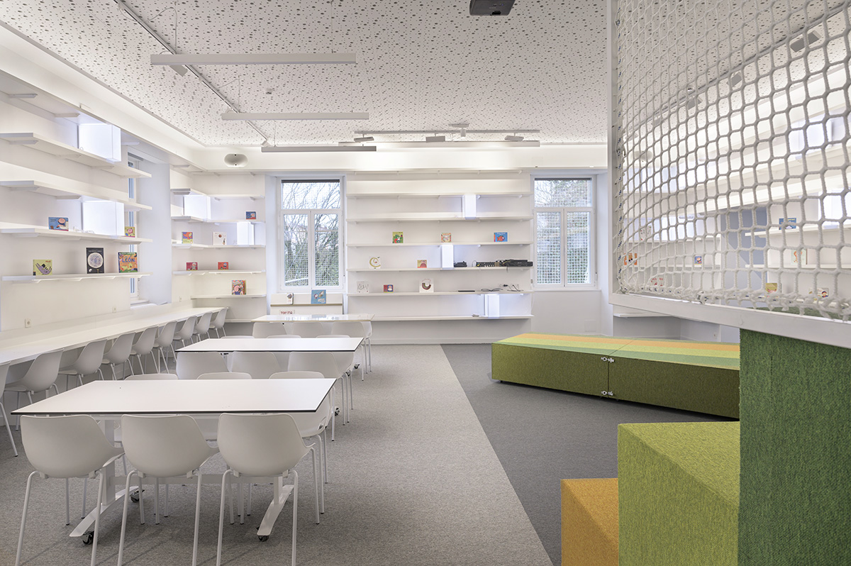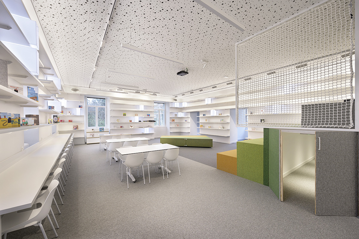 No se trata solo de un espacio donde el punto de partida estilístico y conceptual es la biblioteca, un lugar para leer y estudiar, sino también, un nuevo lugar moderno en el colegio que será transformado en un espacio multifuncional. Debíamos combinar las distintas zonas (mesas para el estudio, diferentes rincones de lectura, un graderío para recibir charlas, una zona de teatro y presentaciones, un espacio de almacenaje y una sala bajo el graderío para el deleite de los más txikis) en un solo espacio multifuncional equilibrado.