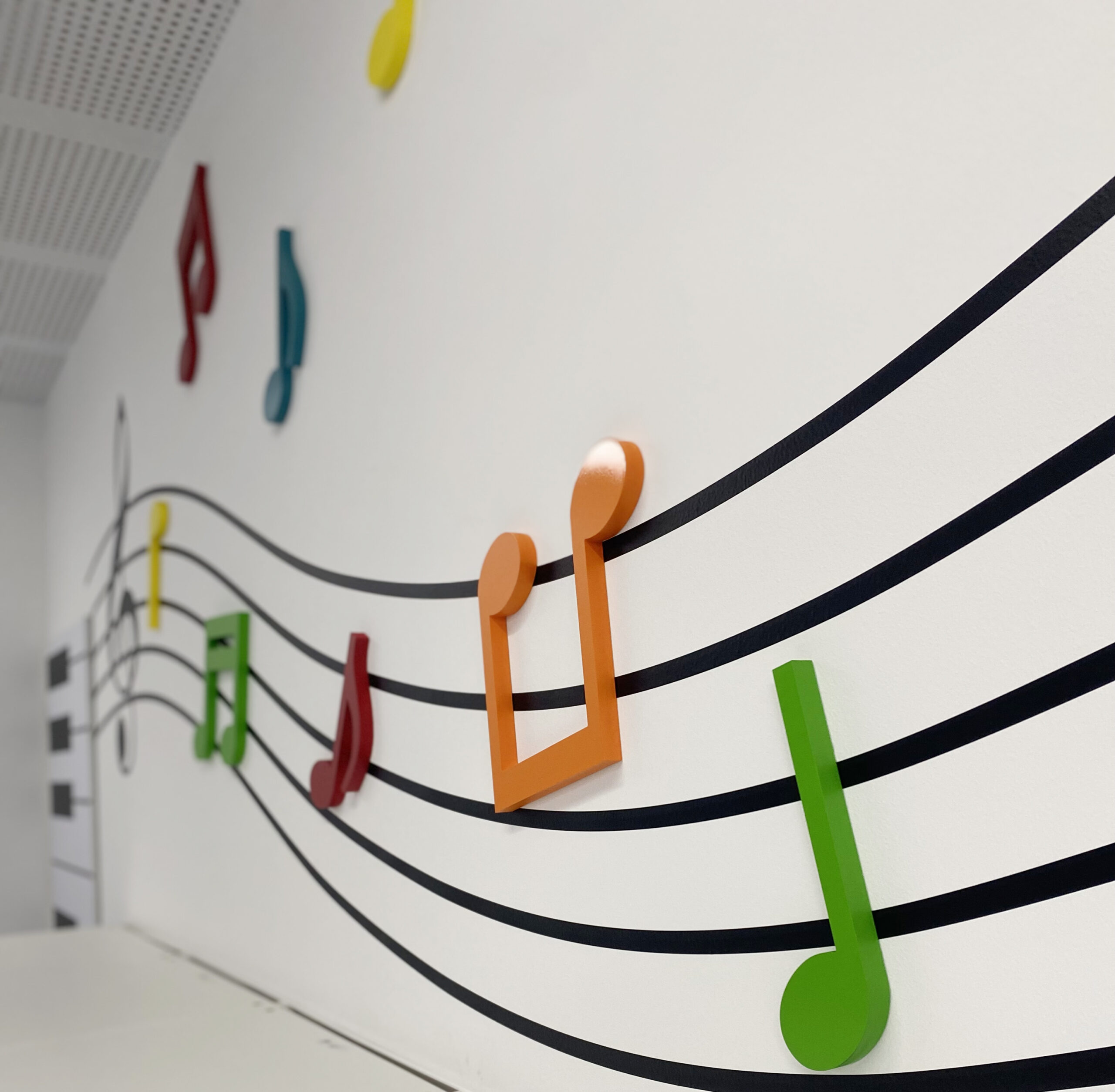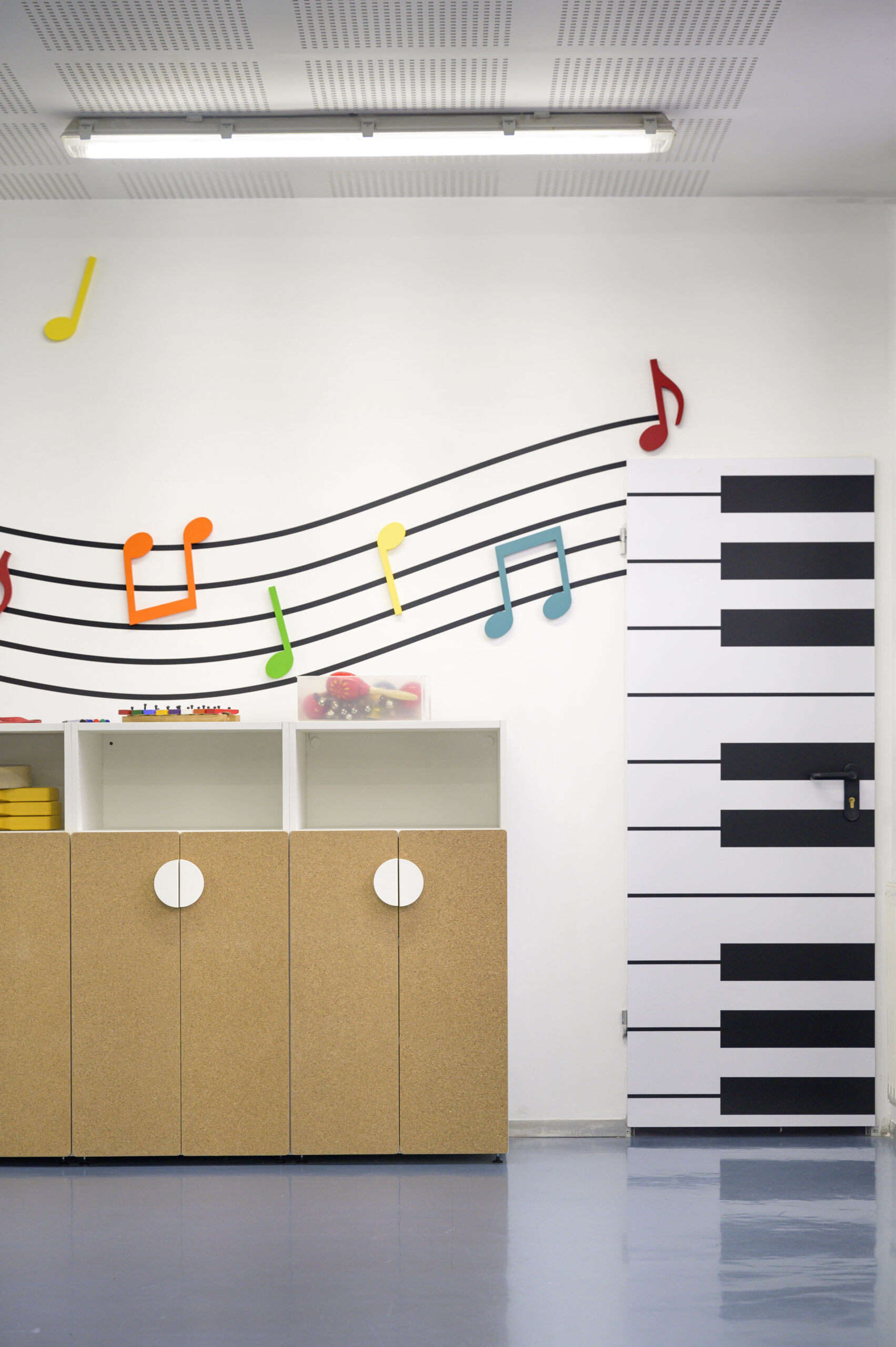 Como en muchos proyectos de la parte creativa se encarga, La Consulta Creativa, que ha diseñado un espacio donde las notas musicales gigantes discurren por las paredes. Coloridas notas que navegan por pentagramas imposibles y grandes teclados. Un lugar donde la música y su lenguaje tiene el protagonismo que se merece.